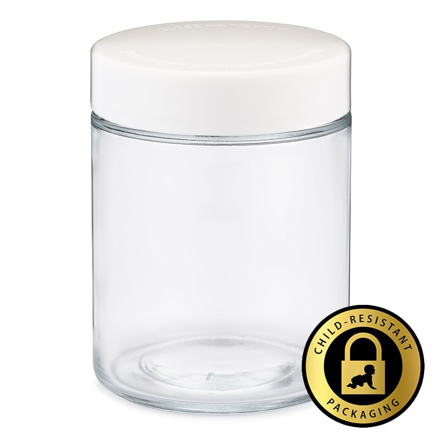 18oz child resistant glass jars fit 1oz of flower and are compliant with all state guidelines. Give your products a high-class look and feel with our state compliant Child-Resistant Glass Jars!