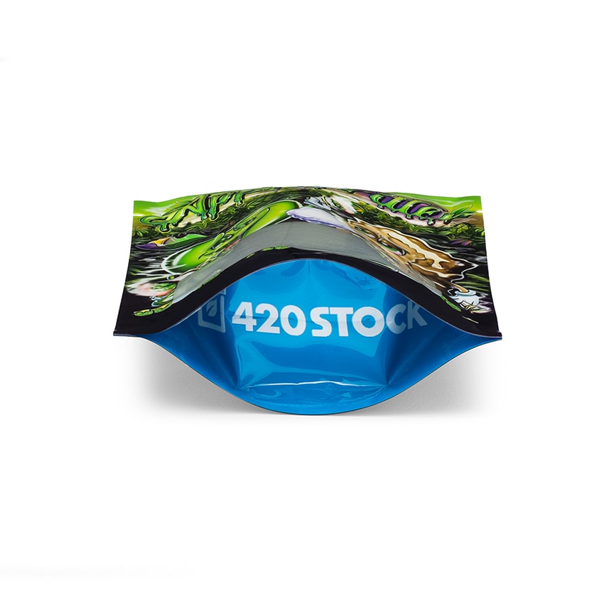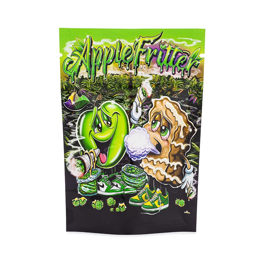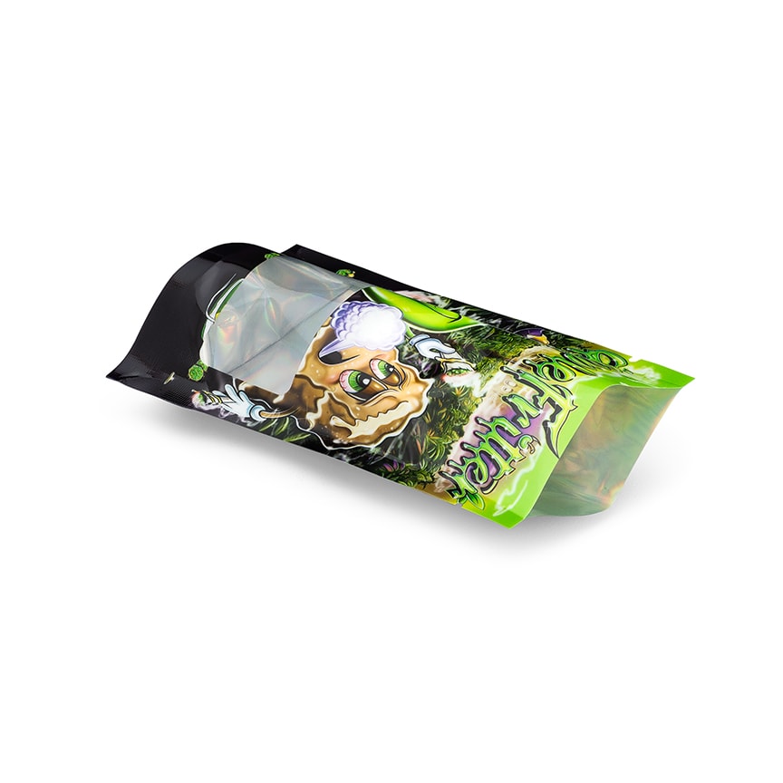 Our Apple Fritter bags feature two lovable apple and pastry characters hanging out and getting high at a grow op! Our one of a kind bags won’t be found anywhere else and also feature a 420 Stock branded gusset at the bottom of the bag. These bags also have a laser printed rainbow interior and feature a viewing window so that you can show off the goods in style! 420 Stock Trapper Bags are great for dressing up your product and create a fun experience for the end user!