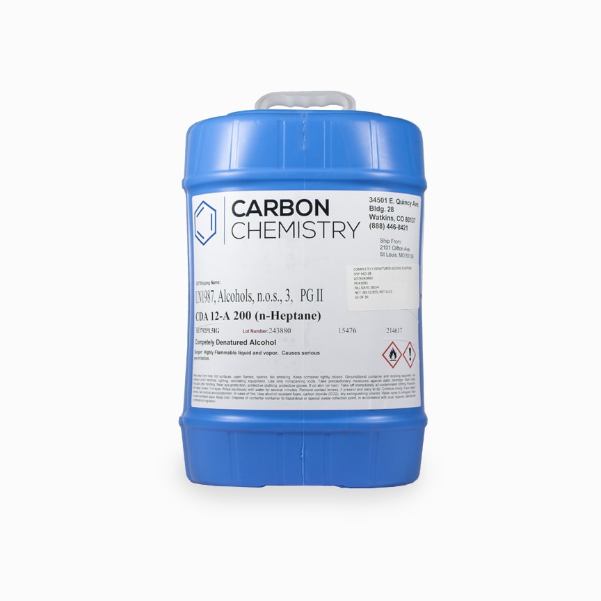 Denatured Ethanol w/ 5% N-Heptane or CDA 12-A 200 is a completely denatured Ethyl Alcohol typically used during the plant extraction process and as a solvent in cleaning the oil during the winterization/ purification process. This is a blended azeotropic product made up of 95% 200 proof Food and USP Grade Ethanol with 5% high purity n-heptane, which is an industry approved standard solvent. It evaporates completely and leaves no taste. Because n-Heptane has a higher boiling point than Ethanol, it may be necessary to heat the evaporator to a higher temperature (+5-10°C).