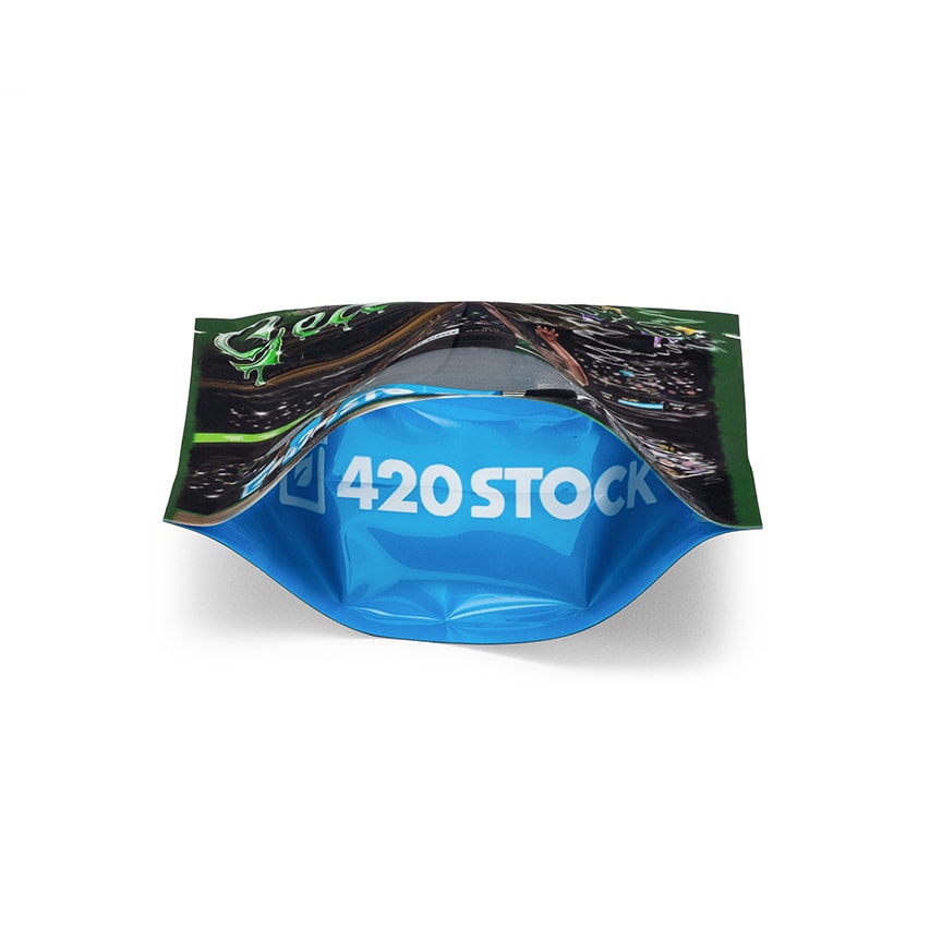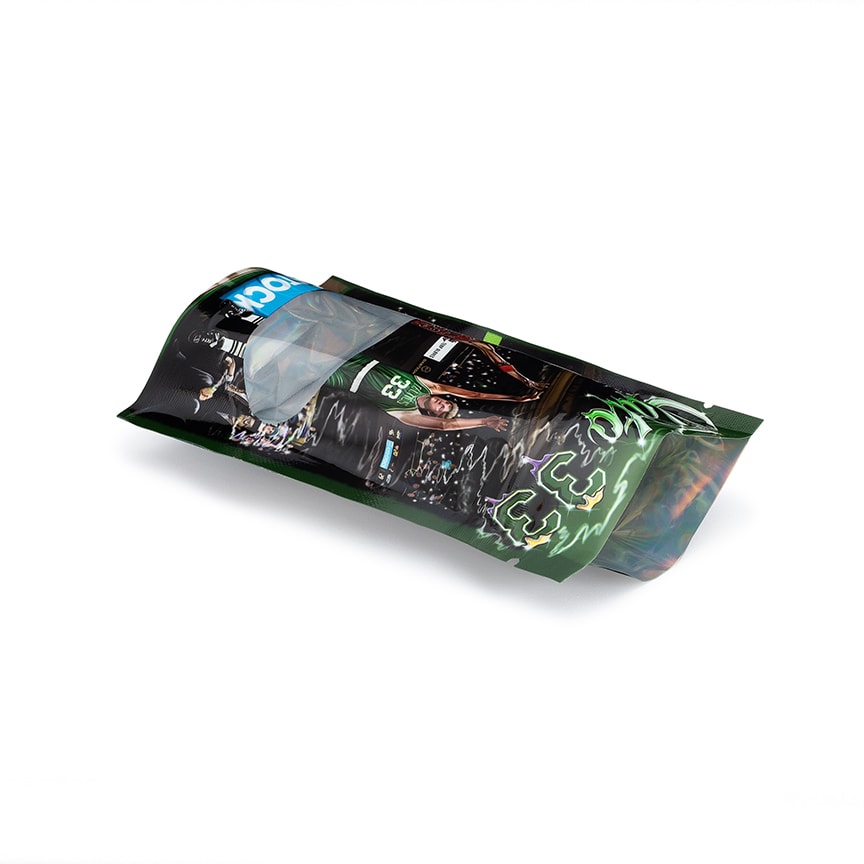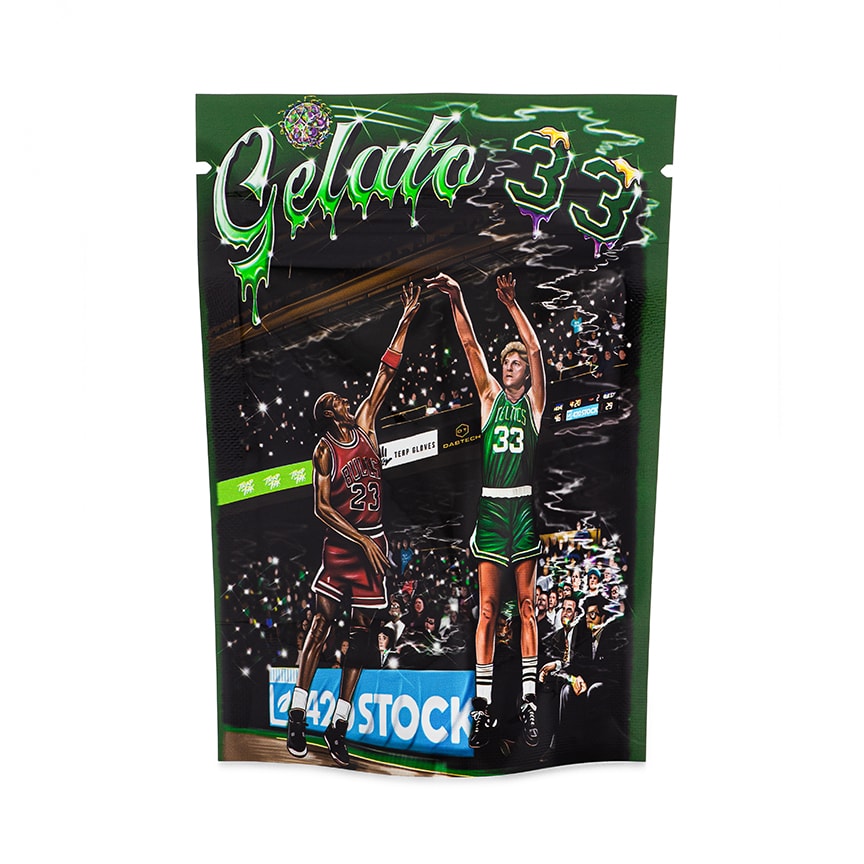 Our Gelato 33 bags depict an epic late 80’s/early 90’s match up between 2 NBA legends Michael Jordan and Larry Bird, with Bird shooting a jumper over Jordan. Keep an eye out for the people in the stands smoking a giant spliff of Gelato! Our one of a kind bags won’t be found anywhere else and also feature a 420 Stock branded gusset at the bottom of the bag. These bags also have a laser printed rainbow interior and feature a viewing window so that you can show off the goods in style! 420 Stock Trapper Bags are great for dressing up your product and create a fun experience for the end user!