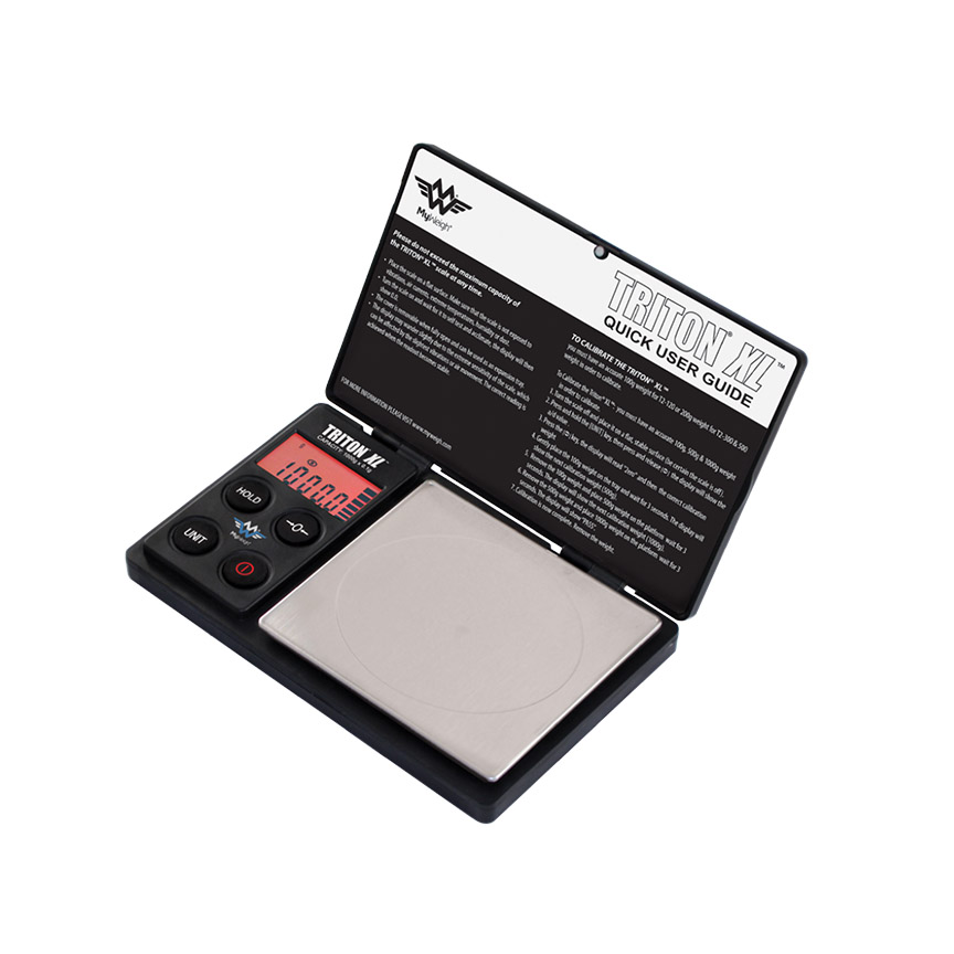The Triton T2 XL 1000 from My Weigh, is an enhanced and updated version of the proven and affordable My Weigh Triton. It is now upgraded with a 1,000 gram capacity, plus with a larger weighing platform.  The Triton XL is a durable pocket scale sporting a hinged hard-cover that doubles as a removable expansion tray, plus an easy-to-read LCD display, non-slip rubber grips. The stainless tray is a generous 4″ x 4.6″.