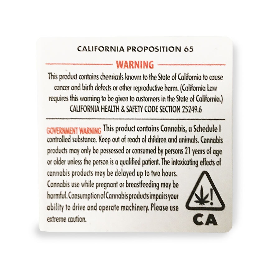 Our Prop 64 Compliant Labels are a great choice for those striving to comply with CA State laws regarding labeling standards. Not only do our labels feature warnings as required by the State of CA, but they also include a Prop 65 Warning which helps protect against lawsuits regarding exposure to cancer.