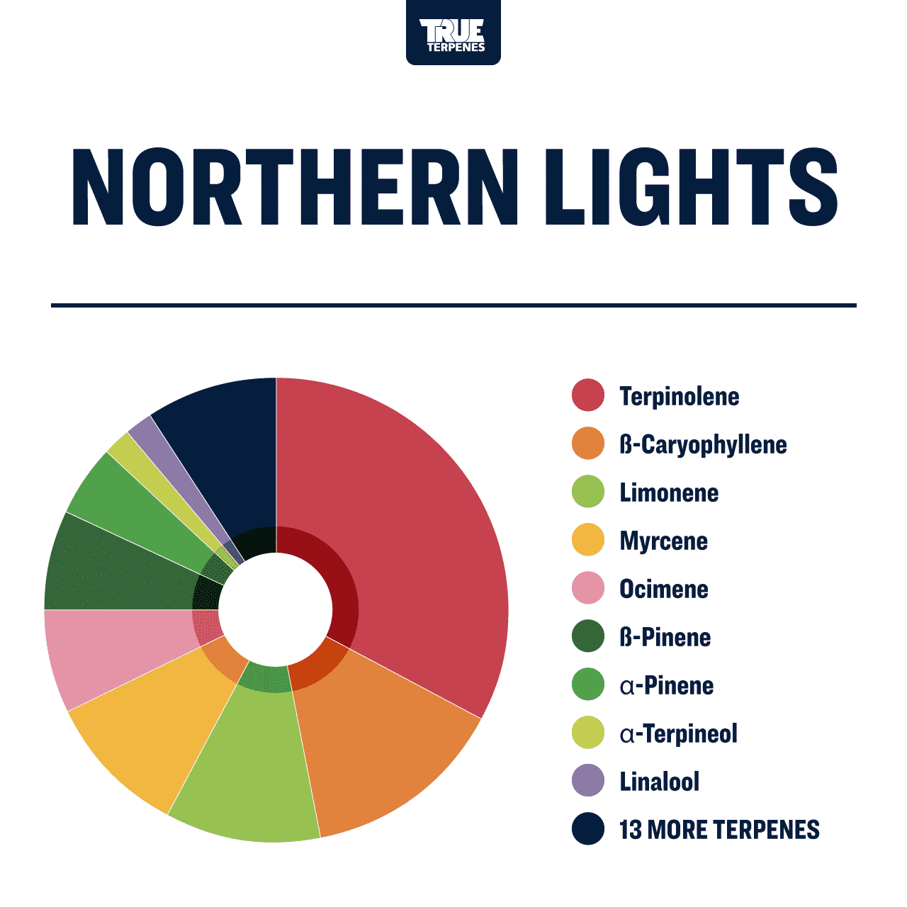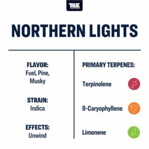 Northern Lights is one of the most popular cultivars in history. It’s thought to be a cross of the landrace varieties Thai and Afghani. Terpinolene leads the way giving this profile a pine, fuel punch.