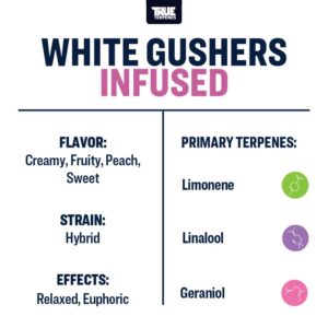 Bliss out with this super juicy mix of creamy peach and tropical punch with a subtle kush note hiding in the back. Limonene and Linalool bring a relaxed, euphoric vibe.