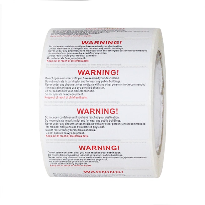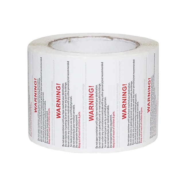 Warning Labels are a great way to minimize liability for dispensary owners. Our warning labels feature generic warning text and also work well in conjunction with other labels. Great for use on pop top and reversible bottles, pre roll tubes, mylar bags, or even a tamper evident seal on exit packaging.